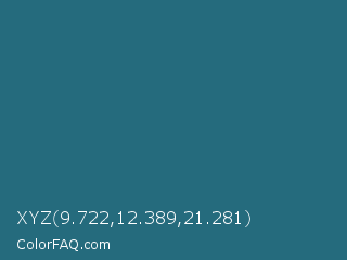 XYZ 9.722,12.389,21.281 Color is a normal cyan color and the nearest color is Elm #1c7c7d. Hex code #256b7d and RGB value is rgb(37,107,125). In RGB color space, this color is composed of 15% red, 42% green, 49% blue, In CMYK color space, this color is composed of 70% cyan, 14% magenta, 0% yellow , 51% black , In HSL color space, this color has a hue angle of 192° , 54% saturation and 32% lightness.