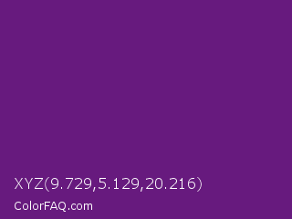 XYZ 9.729,5.129,20.216 Color is a dark purple color and the nearest color is Midnight #702670. Hex code #671a7e and RGB value is rgb(103,26,126). In RGB color space, this color is composed of 40% red, 10% green, 49% blue, In CMYK color space, this color is composed of 18% cyan, 79% magenta, 0% yellow , 51% black , In HSL color space, this color has a hue angle of 286° , 66% saturation and 30% lightness.
