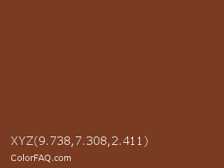 XYZ 9.738,7.308,2.411 Color is a dark orange color and the nearest color is Walnut #773f1a. Hex code #793b22 and RGB value is rgb(121,59,34). In RGB color space, this color is composed of 47% red, 23% green, 13% blue, In CMYK color space, this color is composed of 0% cyan, 51% magenta, 72% yellow , 53% black , In HSL color space, this color has a hue angle of 17° , 56% saturation and 30% lightness.