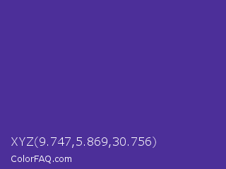 XYZ 9.747,5.869,30.756 Color is a normal indigo color and the nearest color is Daisy Bush #4f2398. Hex code #4c2f99 and RGB value is rgb(76,47,153). In RGB color space, this color is composed of 30% red, 18% green, 60% blue, In CMYK color space, this color is composed of 50% cyan, 69% magenta, 0% yellow , 40% black , In HSL color space, this color has a hue angle of 256° , 53% saturation and 39% lightness.