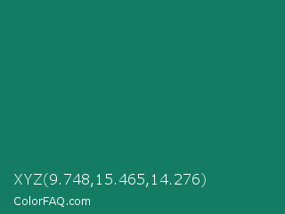 XYZ 9.748,15.465,14.276 Color is a dark cyan color and the nearest color is Deep Green Cyan Turquoise #0e7c61. Hex code #147c63 and RGB value is rgb(20,124,99). In RGB color space, this color is composed of 8% red, 49% green, 39% blue, In CMYK color space, this color is composed of 84% cyan, 0% magenta, 20% yellow , 51% black , In HSL color space, this color has a hue angle of 166° , 72% saturation and 28% lightness.