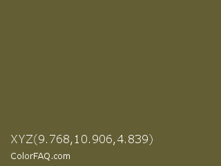 XYZ 9.768,10.906,4.839 Color is a dark yellow color and the nearest color is Costa Del Sol #615d30. Hex code #635e34 and RGB value is rgb(99,94,52). In RGB color space, this color is composed of 39% red, 37% green, 20% blue, In CMYK color space, this color is composed of 0% cyan, 5% magenta, 47% yellow , 61% black , In HSL color space, this color has a hue angle of 54° , 31% saturation and 30% lightness.