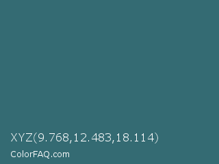 XYZ 9.768,12.483,18.114 Color is a normal cyan color and the nearest color is Oracle #377475. Hex code #346b73 and RGB value is rgb(52,107,115). In RGB color space, this color is composed of 20% red, 42% green, 45% blue, In CMYK color space, this color is composed of 55% cyan, 7% magenta, 0% yellow , 55% black , In HSL color space, this color has a hue angle of 188° , 38% saturation and 33% lightness.