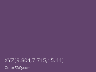 XYZ 9.804,7.715,15.44 Color is a normal purple color and the nearest color is Cyber Grape #58427c. Hex code #62436d and RGB value is rgb(98,67,109). In RGB color space, this color is composed of 38% red, 26% green, 43% blue, In CMYK color space, this color is composed of 10% cyan, 39% magenta, 0% yellow , 57% black , In HSL color space, this color has a hue angle of 284° , 24% saturation and 35% lightness.