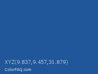 XYZ 9.837,9.457,31.879 Color is a normal blue color and the nearest color is Cyan Cobalt Blue #28589c. Hex code #20579a and RGB value is rgb(32,87,154). In RGB color space, this color is composed of 13% red, 34% green, 60% blue, In CMYK color space, this color is composed of 79% cyan, 44% magenta, 0% yellow , 40% black , In HSL color space, this color has a hue angle of 213° , 66% saturation and 36% lightness.