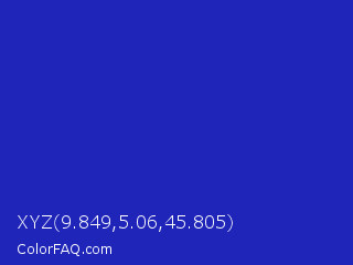 XYZ 9.849,5.06,45.805 Color is a normal blue color and the nearest color is Persian Blue #1c39bb. Hex code #1e25b8 and RGB value is rgb(30,37,184). In RGB color space, this color is composed of 12% red, 15% green, 72% blue, In CMYK color space, this color is composed of 84% cyan, 80% magenta, 0% yellow , 28% black , In HSL color space, this color has a hue angle of 237° , 72% saturation and 42% lightness.
