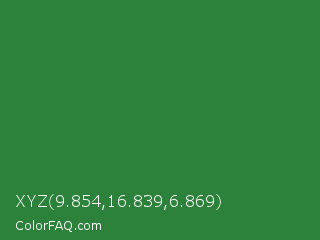 XYZ 9.854,16.839,6.869 Color is a normal green color and the nearest color is Goblin #3d7d52. Hex code #2d823b and RGB value is rgb(45,130,59). In RGB color space, this color is composed of 18% red, 51% green, 23% blue, In CMYK color space, this color is composed of 65% cyan, 0% magenta, 55% yellow , 49% black , In HSL color space, this color has a hue angle of 130° , 49% saturation and 34% lightness.
