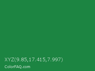 XYZ 9.85,17.415,7.997 Color is a normal green color and the nearest color is Dark Spring Green #177245. Hex code #1c8542 and RGB value is rgb(28,133,66). In RGB color space, this color is composed of 11% red, 52% green, 26% blue, In CMYK color space, this color is composed of 79% cyan, 0% magenta, 50% yellow , 48% black , In HSL color space, this color has a hue angle of 142° , 65% saturation and 32% lightness.