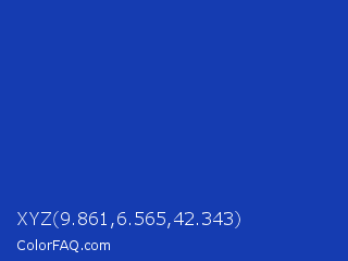 XYZ 9.861,6.565,42.343 Color is a normal blue color and the nearest color is Persian Blue #1c39bb. Hex code #153cb1 and RGB value is rgb(21,60,177). In RGB color space, this color is composed of 8% red, 24% green, 69% blue, In CMYK color space, this color is composed of 88% cyan, 66% magenta, 0% yellow , 31% black , In HSL color space, this color has a hue angle of 225° , 79% saturation and 39% lightness.