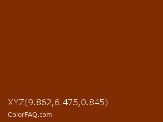 XYZ 9.862,6.475,0.845 Color is a dark orange color and the nearest color is Smokey Topaz #832a0d. Hex code #802d04 and RGB value is rgb(128,45,4). In RGB color space, this color is composed of 50% red, 18% green, 2% blue, In CMYK color space, this color is composed of 0% cyan, 65% magenta, 97% yellow , 50% black , In HSL color space, this color has a hue angle of 20° , 94% saturation and 26% lightness.
