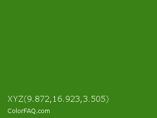 XYZ 9.872,16.923,3.505 Color is a dark green color and the nearest color is La Palma #368716. Hex code #3a8216 and RGB value is rgb(58,130,22). In RGB color space, this color is composed of 23% red, 51% green, 9% blue, In CMYK color space, this color is composed of 55% cyan, 0% magenta, 83% yellow , 49% black , In HSL color space, this color has a hue angle of 100° , 71% saturation and 30% lightness.