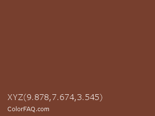 XYZ 9.878,7.674,3.545 Color is a normal red color and the nearest color is Nutmeg #81422c. Hex code #773f2e and RGB value is rgb(119,63,46). In RGB color space, this color is composed of 47% red, 25% green, 18% blue, In CMYK color space, this color is composed of 0% cyan, 47% magenta, 61% yellow , 53% black , In HSL color space, this color has a hue angle of 14° , 44% saturation and 32% lightness.