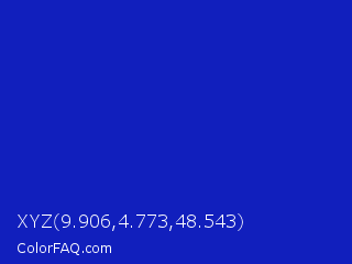XYZ 9.906,4.773,48.543 Color is a normal blue color and the nearest color is Blue Pantone #0018a8. Hex code #111fbd and RGB value is rgb(17,31,189). In RGB color space, this color is composed of 7% red, 12% green, 74% blue, In CMYK color space, this color is composed of 91% cyan, 84% magenta, 0% yellow , 26% black , In HSL color space, this color has a hue angle of 235° , 83% saturation and 40% lightness.