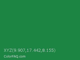 XYZ 9.907,17.442,8.155 Color is a normal green color and the nearest color is Dark Spring Green #177245. Hex code #1d8543 and RGB value is rgb(29,133,67). In RGB color space, this color is composed of 11% red, 52% green, 26% blue, In CMYK color space, this color is composed of 78% cyan, 0% magenta, 50% yellow , 48% black , In HSL color space, this color has a hue angle of 142° , 64% saturation and 32% lightness.