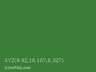 XYZ 9.92,16.107,6.327 Color is a normal green color and the nearest color is Fern Green #4f7942. Hex code #3a7e38 and RGB value is rgb(58,126,56). In RGB color space, this color is composed of 23% red, 49% green, 22% blue, In CMYK color space, this color is composed of 54% cyan, 0% magenta, 56% yellow , 51% black , In HSL color space, this color has a hue angle of 118° , 38% saturation and 36% lightness.