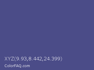 XYZ 9.93,8.442,24.399 Color is a normal blue color and the nearest color is Purple Navy #4e5180. Hex code #4b4c88 and RGB value is rgb(75,76,136). In RGB color space, this color is composed of 29% red, 30% green, 53% blue, In CMYK color space, this color is composed of 45% cyan, 44% magenta, 0% yellow , 47% black , In HSL color space, this color has a hue angle of 239° , 29% saturation and 41% lightness.