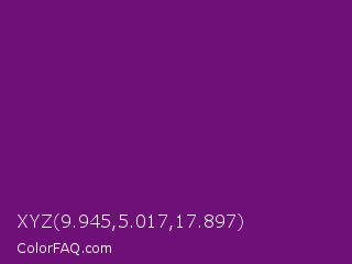 XYZ 9.945,5.017,17.897 Color is a dark magenta color and the nearest color is Midnight #702670. Hex code #6e1077 and RGB value is rgb(110,16,119). In RGB color space, this color is composed of 43% red, 6% green, 47% blue, In CMYK color space, this color is composed of 8% cyan, 87% magenta, 0% yellow , 53% black , In HSL color space, this color has a hue angle of 295° , 76% saturation and 26% lightness.