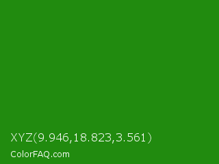 XYZ 9.946,18.823,3.561 Color is a dark green color and the nearest color is Slimy Green #299617. Hex code #218b0f and RGB value is rgb(33,139,15). In RGB color space, this color is composed of 13% red, 55% green, 6% blue, In CMYK color space, this color is composed of 76% cyan, 0% magenta, 89% yellow , 45% black , In HSL color space, this color has a hue angle of 111° , 81% saturation and 30% lightness.