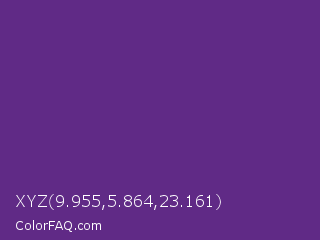 XYZ 9.955,5.864,23.161 Color is a normal purple color and the nearest color is Eminence #6c3082. Hex code #602a86 and RGB value is rgb(96,42,134). In RGB color space, this color is composed of 38% red, 16% green, 53% blue, In CMYK color space, this color is composed of 28% cyan, 69% magenta, 0% yellow , 47% black , In HSL color space, this color has a hue angle of 275° , 52% saturation and 35% lightness.