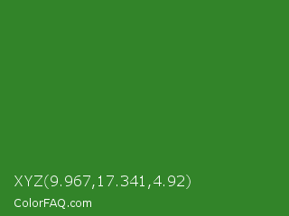 XYZ 9.967,17.341,4.92 Color is a normal green color and the nearest color is Forest Green #228b22. Hex code #328429 and RGB value is rgb(50,132,41). In RGB color space, this color is composed of 20% red, 52% green, 16% blue, In CMYK color space, this color is composed of 62% cyan, 0% magenta, 69% yellow , 48% black , In HSL color space, this color has a hue angle of 114° , 53% saturation and 34% lightness.