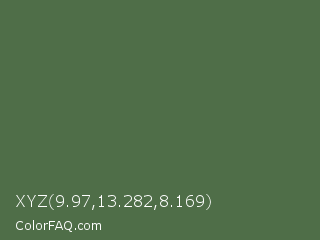 XYZ 9.97,13.282,8.169 Color is a normal green color and the nearest color is Axolotl #4e6649. Hex code #4f6e48 and RGB value is rgb(79,110,72). In RGB color space, this color is composed of 31% red, 43% green, 28% blue, In CMYK color space, this color is composed of 28% cyan, 0% magenta, 35% yellow , 57% black , In HSL color space, this color has a hue angle of 109° , 21% saturation and 36% lightness.