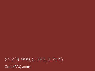 XYZ 9.999,6.393,2.714 Color is a normal red color and the nearest color is Red Robin #80341f. Hex code #7f2b28 and RGB value is rgb(127,43,40). In RGB color space, this color is composed of 50% red, 17% green, 16% blue, In CMYK color space, this color is composed of 0% cyan, 66% magenta, 69% yellow , 50% black , In HSL color space, this color has a hue angle of 2° , 52% saturation and 33% lightness.
