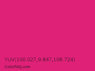 YUV 100.027,9.847,108.724 Color is a normal rose color and the nearest color is Vivid Cerise #da1d81. Hex code #e02178 and RGB value is rgb(224,33,120). In RGB color space, this color is composed of 88% red, 13% green, 47% blue, In CMYK color space, this color is composed of 0% cyan, 85% magenta, 46% yellow , 12% black , In HSL color space, this color has a hue angle of 333° , 75% saturation and 50% lightness.