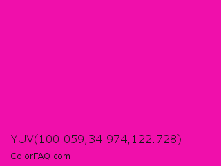 YUV 100.059,34.974,122.728 Color is a normal magenta color and the nearest color is Hollywood Cerise #f400a1. Hex code #f00fab and RGB value is rgb(240,15,171). In RGB color space, this color is composed of 94% red, 6% green, 67% blue, In CMYK color space, this color is composed of 0% cyan, 94% magenta, 29% yellow , 6% black , In HSL color space, this color has a hue angle of 318° , 88% saturation and 50% lightness.