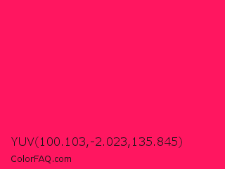 YUV 100.103,-2.023,135.845 Color is a normal rose color and the nearest color is Awesome #ff2052. Hex code #ff1660 and RGB value is rgb(255,22,96). In RGB color space, this color is composed of 100% red, 9% green, 38% blue, In CMYK color space, this color is composed of 0% cyan, 91% magenta, 62% yellow , 0% black , In HSL color space, this color has a hue angle of 341° , 100% saturation and 54% lightness.