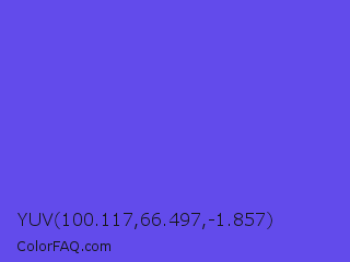 YUV 100.117,66.497,-1.857 Color is a light indigo color and the nearest color is Majorelle Blue #6050dc. Hex code #624beb and RGB value is rgb(98,75,235). In RGB color space, this color is composed of 38% red, 29% green, 92% blue, In CMYK color space, this color is composed of 58% cyan, 68% magenta, 0% yellow , 8% black , In HSL color space, this color has a hue angle of 249° , 80% saturation and 61% lightness.