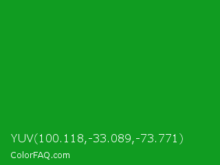 YUV 100.118,-33.089,-73.771 Color is a normal green color and the nearest color is North Texas Green #059033. Hex code #109c21 and RGB value is rgb(16,156,33). In RGB color space, this color is composed of 6% red, 61% green, 13% blue, In CMYK color space, this color is composed of 90% cyan, 0% magenta, 79% yellow , 39% black , In HSL color space, this color has a hue angle of 127° , 81% saturation and 34% lightness.
