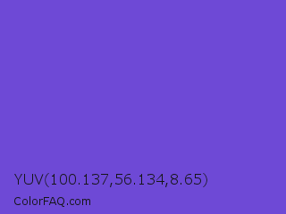 YUV 100.137,56.134,8.65 Color is a normal indigo color and the nearest color is Majorelle Blue #6050dc. Hex code #6e49d6 and RGB value is rgb(110,73,214). In RGB color space, this color is composed of 43% red, 29% green, 84% blue, In CMYK color space, this color is composed of 49% cyan, 66% magenta, 0% yellow , 16% black , In HSL color space, this color has a hue angle of 256° , 63% saturation and 56% lightness.