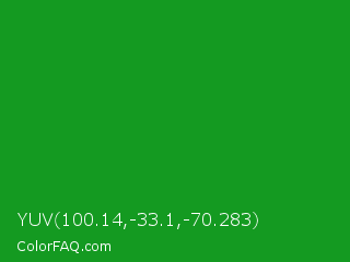 YUV 100.14,-33.1,-70.283 Color is a normal green color and the nearest color is Forest Green #228b22. Hex code #149a21 and RGB value is rgb(20,154,33). In RGB color space, this color is composed of 8% red, 60% green, 13% blue, In CMYK color space, this color is composed of 87% cyan, 0% magenta, 79% yellow , 40% black , In HSL color space, this color has a hue angle of 126° , 77% saturation and 34% lightness.