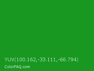 YUV 100.162,-33.111,-66.794 Color is a normal green color and the nearest color is Forest Green #228b22. Hex code #189821 and RGB value is rgb(24,152,33). In RGB color space, this color is composed of 9% red, 60% green, 13% blue, In CMYK color space, this color is composed of 84% cyan, 0% magenta, 78% yellow , 40% black , In HSL color space, this color has a hue angle of 124° , 73% saturation and 35% lightness.