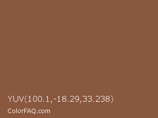 YUV 100.1,-18.29,33.238 Color is a normal orange color and the nearest color is Spicy Mix #885342. Hex code #8a583f and RGB value is rgb(138,88,63). In RGB color space, this color is composed of 54% red, 35% green, 25% blue, In CMYK color space, this color is composed of 0% cyan, 36% magenta, 54% yellow , 46% black , In HSL color space, this color has a hue angle of 20° , 37% saturation and 39% lightness.