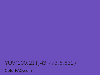 YUV 100.211,43.773,6.831 Color is a normal indigo color and the nearest color is Blue Violet #6456b7. Hex code #6c4fbd and RGB value is rgb(108,79,189). In RGB color space, this color is composed of 42% red, 31% green, 74% blue, In CMYK color space, this color is composed of 43% cyan, 58% magenta, 0% yellow , 26% black , In HSL color space, this color has a hue angle of 256° , 45% saturation and 53% lightness.