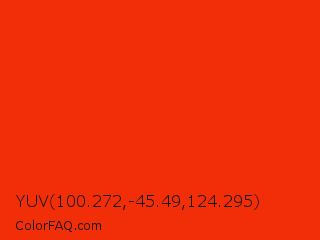 YUV 100.272,-45.49,124.295 Color is a normal red color and the nearest color is Ferrari Red #ff2800. Hex code #f22e08 and RGB value is rgb(242,46,8). In RGB color space, this color is composed of 95% red, 18% green, 3% blue, In CMYK color space, this color is composed of 0% cyan, 81% magenta, 97% yellow , 5% black , In HSL color space, this color has a hue angle of 10° , 94% saturation and 49% lightness.