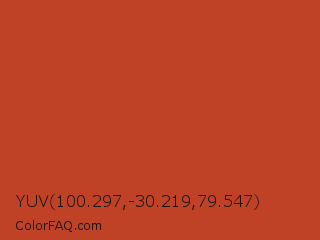 YUV 100.297,-30.219,79.547 Color is a normal red color and the nearest color is Dark Pastel Red #c23b22. Hex code #bf4227 and RGB value is rgb(191,66,39). In RGB color space, this color is composed of 75% red, 26% green, 15% blue, In CMYK color space, this color is composed of 0% cyan, 65% magenta, 80% yellow , 25% black , In HSL color space, this color has a hue angle of 11° , 66% saturation and 45% lightness.