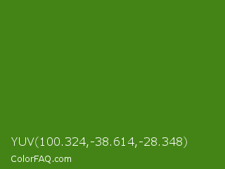 YUV 100.324,-38.614,-28.348 Color is a dark green color and the nearest color is La Palma #368716. Hex code #448416 and RGB value is rgb(68,132,22). In RGB color space, this color is composed of 27% red, 52% green, 9% blue, In CMYK color space, this color is composed of 48% cyan, 0% magenta, 83% yellow , 48% black , In HSL color space, this color has a hue angle of 95° , 71% saturation and 30% lightness.