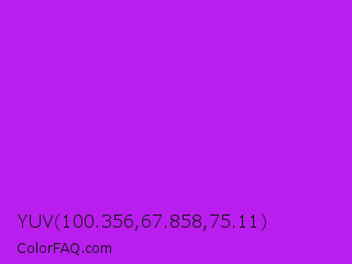YUV 100.356,67.858,75.11 Color is a normal purple color and the nearest color is Vivid Mulberry #b80ce3. Hex code #ba1eee and RGB value is rgb(186,30,238). In RGB color space, this color is composed of 73% red, 12% green, 93% blue, In CMYK color space, this color is composed of 22% cyan, 87% magenta, 0% yellow , 7% black , In HSL color space, this color has a hue angle of 285° , 86% saturation and 53% lightness.