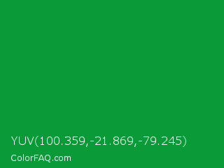 YUV 100.359,-21.869,-79.245 Color is a normal green color and the nearest color is North Texas Green #059033. Hex code #0a9b38 and RGB value is rgb(10,155,56). In RGB color space, this color is composed of 4% red, 61% green, 22% blue, In CMYK color space, this color is composed of 94% cyan, 0% magenta, 64% yellow , 39% black , In HSL color space, this color has a hue angle of 139° , 88% saturation and 32% lightness.
