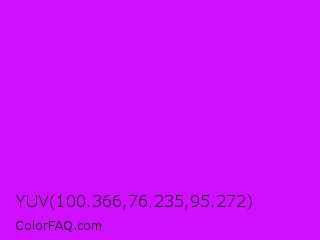 YUV 100.366,76.235,95.272 Color is a normal purple color and the nearest color is Vivid Orchid #cc00ff. Hex code #d10fff and RGB value is rgb(209,15,255). In RGB color space, this color is composed of 82% red, 6% green, 100% blue, In CMYK color space, this color is composed of 18% cyan, 94% magenta, 0% yellow , 0% black , In HSL color space, this color has a hue angle of 289° , 100% saturation and 53% lightness.
