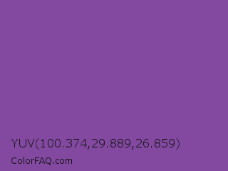 YUV 100.374,29.889,26.859 Color is a normal purple color and the nearest color is Royal Purple #7851a9. Hex code #8349a1 and RGB value is rgb(131,73,161). In RGB color space, this color is composed of 51% red, 29% green, 63% blue, In CMYK color space, this color is composed of 19% cyan, 55% magenta, 0% yellow , 37% black , In HSL color space, this color has a hue angle of 280° , 38% saturation and 46% lightness.