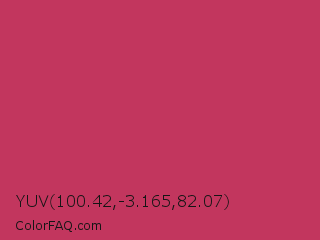 YUV 100.42,-3.165,82.07 Color is a normal rose color and the nearest color is Dingy Dungeon #c53151. Hex code #c2365e and RGB value is rgb(194,54,94). In RGB color space, this color is composed of 76% red, 21% green, 37% blue, In CMYK color space, this color is composed of 0% cyan, 72% magenta, 52% yellow , 24% black , In HSL color space, this color has a hue angle of 343° , 56% saturation and 49% lightness.