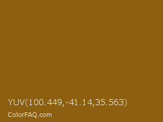 YUV 100.449,-41.14,35.563 Color is a normal orange color and the nearest color is Grizzly #885818. Hex code #8d6011 and RGB value is rgb(141,96,17). In RGB color space, this color is composed of 55% red, 38% green, 7% blue, In CMYK color space, this color is composed of 0% cyan, 32% magenta, 88% yellow , 45% black , In HSL color space, this color has a hue angle of 38° , 78% saturation and 31% lightness.