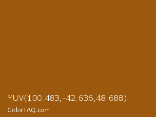 YUV 100.483,-42.636,48.688 Color is a normal orange color and the nearest color is Hawaiian Tan #9d5616. Hex code #9c590e and RGB value is rgb(156,89,14). In RGB color space, this color is composed of 61% red, 35% green, 5% blue, In CMYK color space, this color is composed of 0% cyan, 43% magenta, 91% yellow , 39% black , In HSL color space, this color has a hue angle of 32° , 84% saturation and 33% lightness.