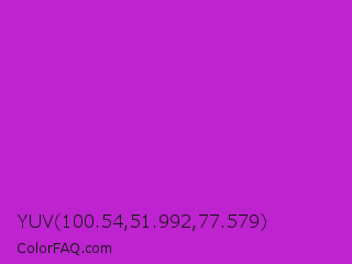 YUV 100.54,51.992,77.579 Color is a normal magenta color and the nearest color is Steel Pink #cc33cc. Hex code #bd23ce and RGB value is rgb(189,35,206). In RGB color space, this color is composed of 74% red, 14% green, 81% blue, In CMYK color space, this color is composed of 8% cyan, 83% magenta, 0% yellow , 19% black , In HSL color space, this color has a hue angle of 294° , 71% saturation and 47% lightness.