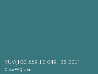 YUV 100.559,12.049,-38.201 Color is a normal cyan color and the nearest color is Ming #36747d. Hex code #39767d and RGB value is rgb(57,118,125). In RGB color space, this color is composed of 22% red, 46% green, 49% blue, In CMYK color space, this color is composed of 54% cyan, 6% magenta, 0% yellow , 51% black , In HSL color space, this color has a hue angle of 186° , 37% saturation and 36% lightness.