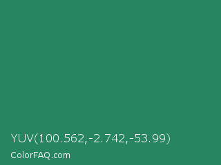 YUV 100.562,-2.742,-53.99 Color is a normal green color and the nearest color is Eucalyptus #278a5b. Hex code #27855f and RGB value is rgb(39,133,95). In RGB color space, this color is composed of 15% red, 52% green, 37% blue, In CMYK color space, this color is composed of 71% cyan, 0% magenta, 29% yellow , 48% black , In HSL color space, this color has a hue angle of 156° , 55% saturation and 34% lightness.