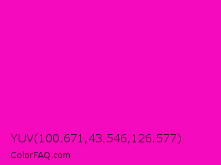 YUV 100.671,43.546,126.577 Color is a normal magenta color and the nearest color is Shocking Pink #fc0fc0. Hex code #f50abd and RGB value is rgb(245,10,189). In RGB color space, this color is composed of 96% red, 4% green, 74% blue, In CMYK color space, this color is composed of 0% cyan, 96% magenta, 23% yellow , 4% black , In HSL color space, this color has a hue angle of 314° , 92% saturation and 50% lightness.